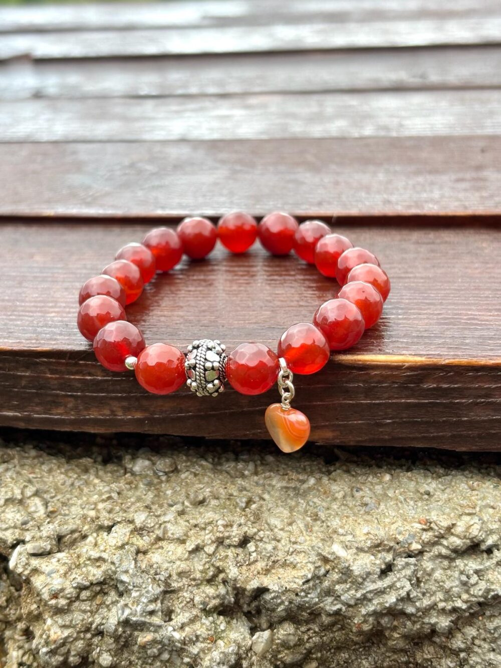Akik Doğal Taş Kalp Sembol Detaylı Gümüş Bileklik