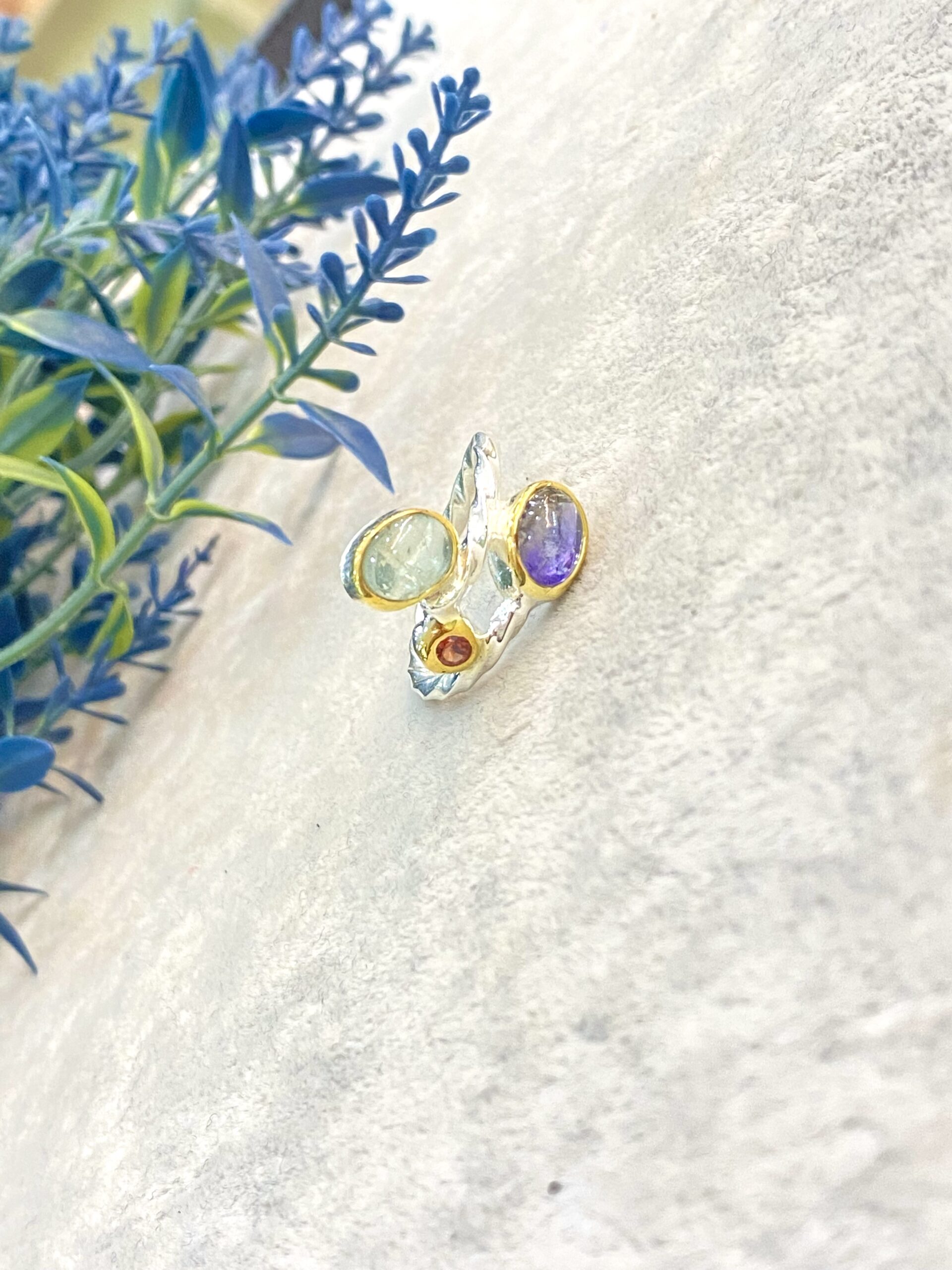 Bu zarif ve nadir bulunan doğal taşlar ile bezeli gümüş yüzük, her biri kendi benzersiz enerjilerini ve güzelliklerini yansıtan Tanzanit, Akuamarin ve Lal taşlarını barındırır. Hem estetik hem de enerjik açıdan zengin bu yüzük, takan kişinin aurisine pozitif etkiler yaparak hem spiritual hem de fiziksel dengeler sağlar.